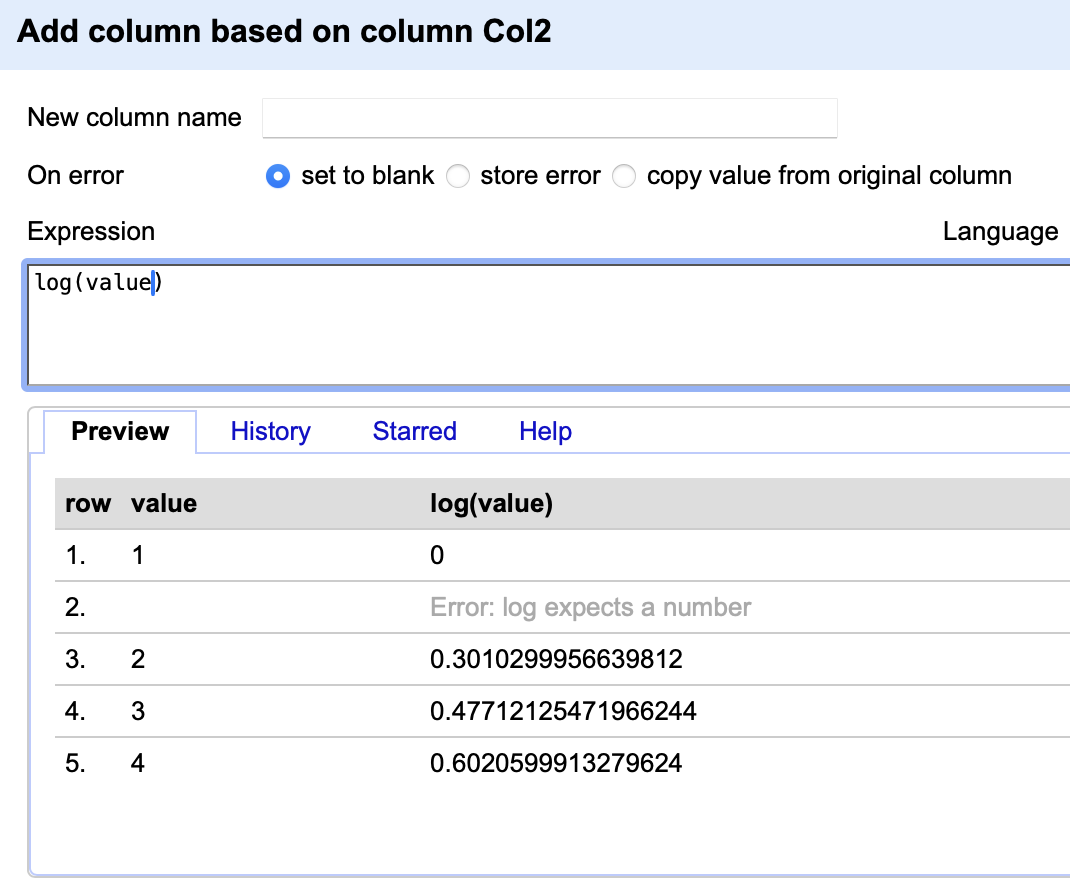 The 'on error' settings refer to an error in processing of the cell with the expression, not an error in the expression itself. So in the example below, there is an error when attepting to apply the expression to an an empty cell -- you have the option of leaving the new cell blank, storing the error message in the cell, or copying the original cell value into the new cell.